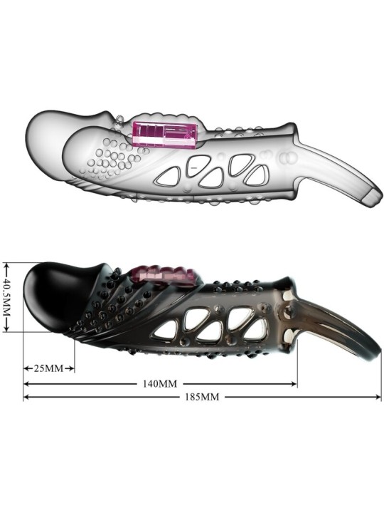Diviértete con esta funda vibradora para el pene. Esta funda para pene que mejora la erección y promete placer está hecha de TPR suave y está asegurada en su lugar por un lazo de bola. Un vibrador en la punta extiende la longitud de su pene y se activa al contacto. Estimulando la cabeza de su eje, también proporciona estimulación interna para ella. La funda elástica envuelve su pene para una erección más fuerte y duradera, ¡lo que le da más tiempo para disfrutar de las vibraciones!