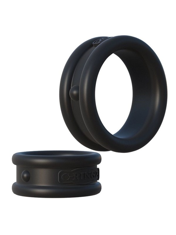 Set de dos anillos con diferentes medidas para que lo utilices en el pene y los testículos. Están fabricados en Silicona Elite muy comfortable de color negro y tienen un grosor de un centímetro aprox, algo ideal para utilizarlo en largas sesiones de sexo. Los dos tienen diferentes diámetros, así podrás encontrar el tamaño exacto o podrás utilizar varios al unísono.
