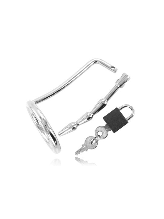 Descubre tu lado mas Bdsm! Coloca la anilla sobre la base de los testiculos e introduce el plug de metal sobre la uretra del pene, coloca el candado y .....comienza la acción! prohibido tener erecciones.