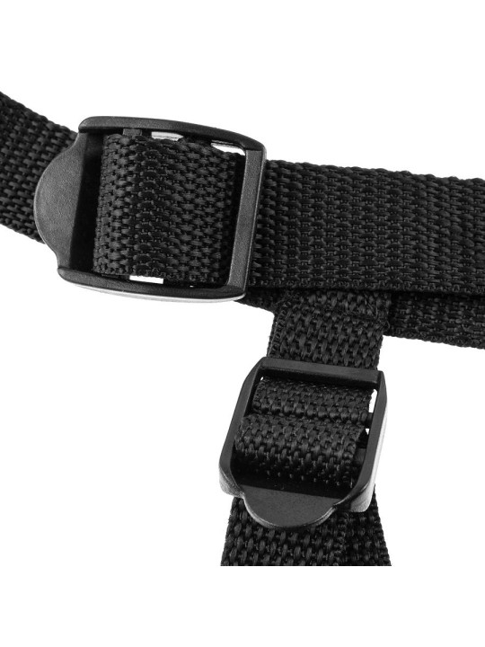 Diseñado para soportar juegos fetichistas extremos, este arnés cuenta con cintas ajustables y una anilla de silicona elástica en la junta tórica.