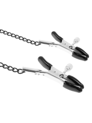 Fabricado de suave cuero vegano y acabado con dos pinzas para pezones con cadenas, este set de collar con pinzas te asegura a tu sujeto al momento. La comoda mordazase ajusta fácilmente a casi todas las tallas, mientras que las pinzas para pezones te ofrecen justo la tensión adecuada en el lugar adecuado. Simplemente ajusta el tornillo a los pezones hasta que quede ajustado y confortable y empieza a disfrutar de placer de un buen pellizco. Sus recubrimientos de goma permitirán que con la acción del momento no se deslicen y permanezcan en su lugar.