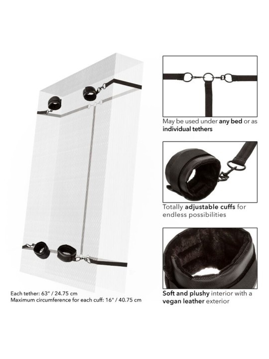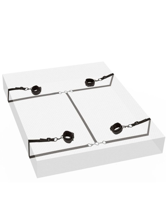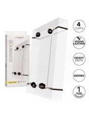 - Información adicional 4 puños de muñeca o tobillo totalmente ajustables y desmontables 4 robustas correas ajustables para adaptarse a la mayoría de los colchones Puede utilizarse bajo cualquier cama o como ataduras individuales Cierres universales y anillos en O con diseño giratorio para una total destreza Interior suave y lujoso con exterior de cuero vegano Costuras dobles acolchadas y cosidas Diseño funcional, duradero y con textura