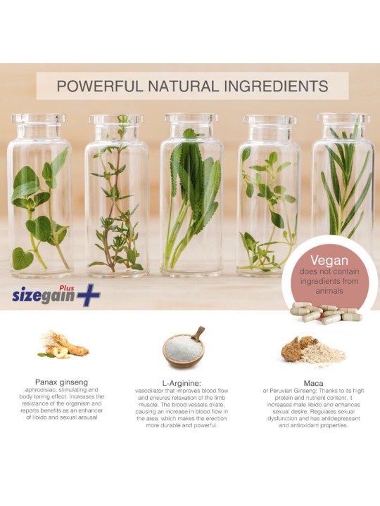 SizeGain Plus es un complemento alimenticio diseñado para favorecer el aumento del tamaño y grosor del pene, reforzar la masculinidad y mejorar la potencia sexual de forma natural. Su fórmula combina extractos herbales seleccionados que estimulan el flujo sanguíneo en la zona genital, favoreciendo una erección más firme, potente y prolongada.