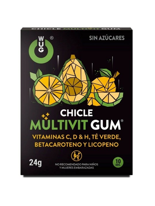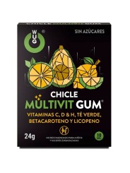 WUG CHICLE MULTIVIT GUM es el complemento alimenticio en formato chicle que contribuye al funcionamiento normal del sistema inmunitario y ayuda a proteger las células frente al daño oxidativo. Con una fórmula a base de Vitaminas C, D y H (Biotina), Betacaroteno, Licopeno y Té Verde, combina nutrientes esenciales y antioxidantes para reforzar las defensas y cuidar tu bienestar diario.