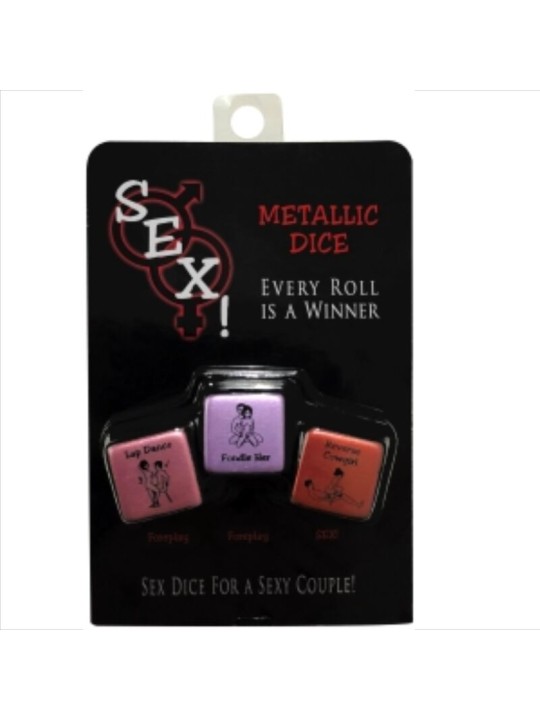 Dados sexuales para una pareja sexy! Tres dados vibrantes de colores metálicos para los juegos previos y sexuales. Túrnense para tirar los dados. Representa cada acción previa en los dos primeros dados. Si se obtiene un comodín, él o ella decide qué acción previa depende del comodín que se obtenga. Si salen ambos comodines, ¡tú ganas! Cuando ganes, también podrás representar el tercer dado "SEXO" después de los dados de juego previo. El rodillo interpreta cómo se representa cada ilustración del dado.