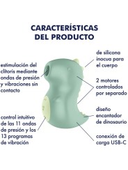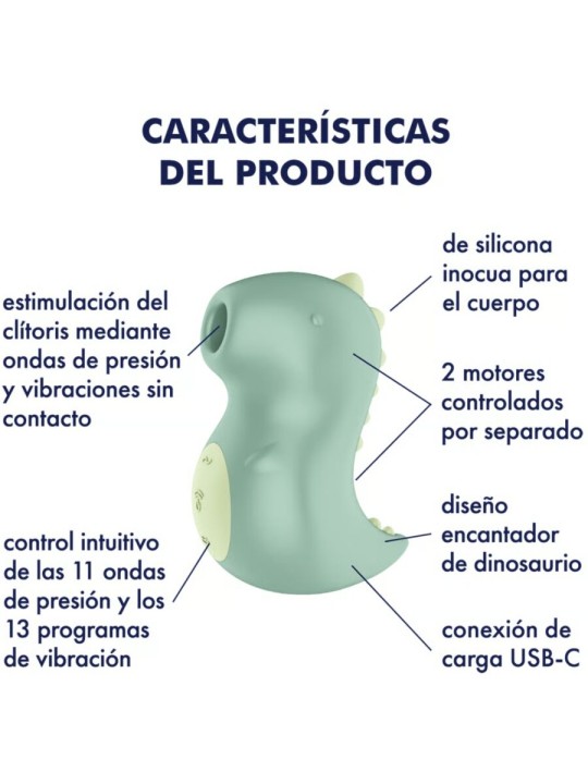 La abertura del vibrador rodea suavemente tu clítoris para crear un sellado perfecto, brindando sensaciones placenteras mediante suaves pulsos de aire, con o sin vibración adicional. Puedes recargar fácilmente tu nuevo juguete favorito mediante el puerto USB-C y utilizar una gota de lubricante para potenciar las sensaciones. Y este dinosaurio tampoco le teme al agua: gracias a su acabado impermeable IPX7, está listo para acompañarte en la ducha o el baño. Descubre el Satisfyer Din-OOOH, un suave vibrador de pulsos de aire para quienes desean disfrutar de dulces sueños con solo tocar un botón.