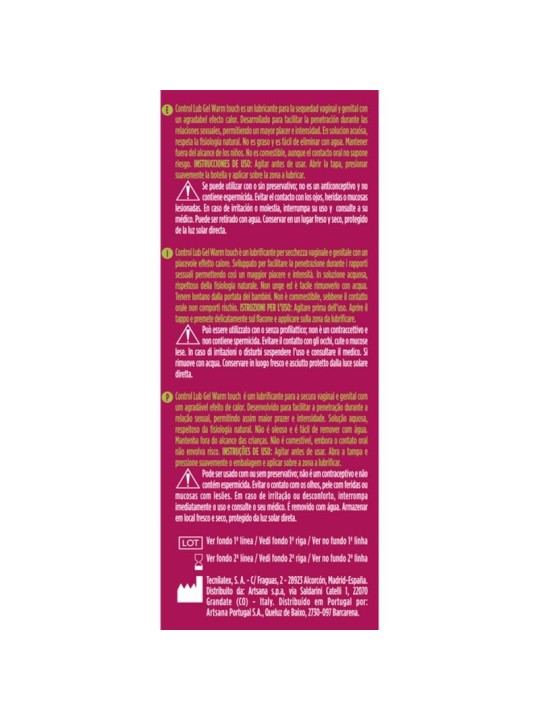 Control Lub Gel Warm Touch es un lubricante para la sequedad vaginal y genital con un agradable efecto calor desarrolado para facilitar la penetración durante las relaciones sexuales permitiendo un mayor placer e intensidad. De base acuosa, respeta la fisiología natural . No es graso y es fácil de eliminar con agua