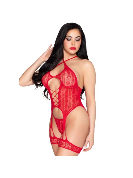 LEG AVENUE - 89338 SET BODY ABIERTO CON LIGUERO + TANGA DE ENCAJE ROJO - TALLA ÚNICA