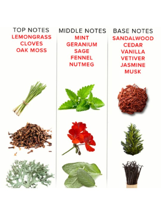 Considere musgo de roble, hierba de limón y clavo mezclados con geranio, sándalo y menta, todo en capas sobre una base sutil de vainilla, jazmín y cedro. Combinado con las feromonas infundidas en el aroma, la sensualidad fluirá de forma natural. Exudarás la confianza que siempre has tenido, con un impulso para ayudar a tu cita o pareja a reconocer y recordar las cosas que los unieron.