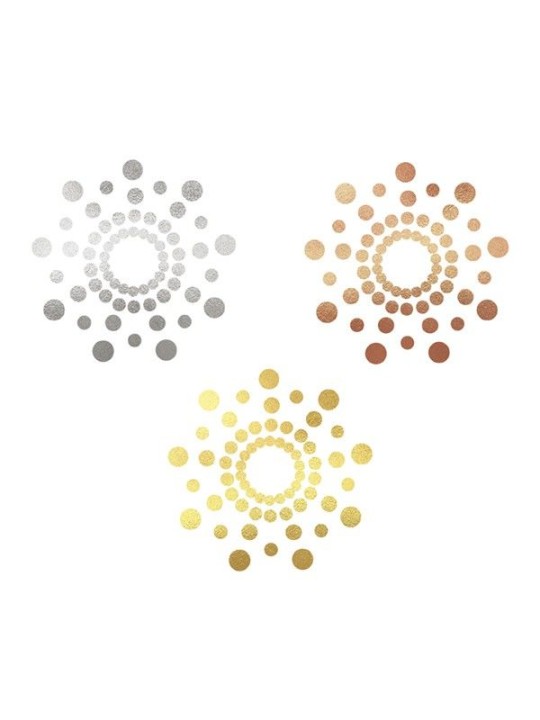 Un juego de tres tatuajes temporales de colores diferentes: dorado, plateado y cobre.