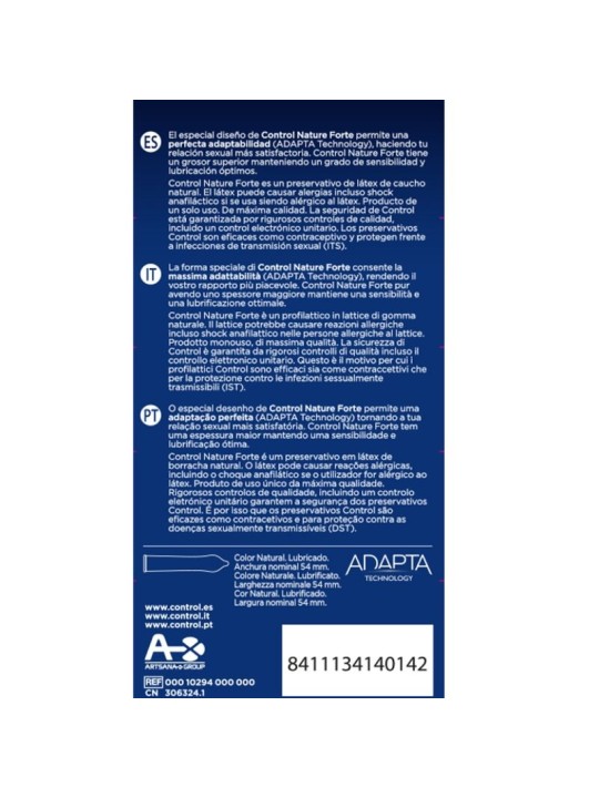 Control Forte es un preservativo de látex de caucho natural, de máxima calidad, liso, anatómico de lados no paralelos, transparente, lubricado y con depósito. Anchura nominal 54 mm. Producto de un solo uso. La seguridad de Control está garantizada oir rigurosos controles de calidad, incluido un control electrónico unitario. Los preservativos Control son eficaces como contraceptivo y protegen frente a enferemedades de transmisión sexual.