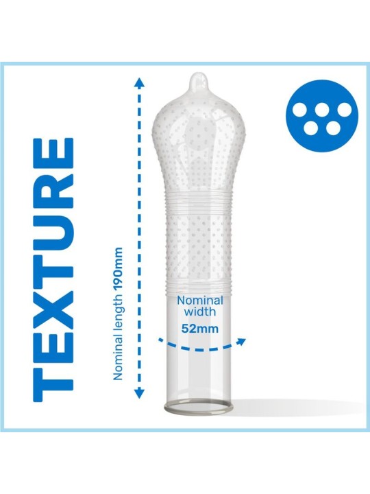 Los condones Pasante Ribs Dots Intensity son condones cónicos, texturizado con nervaduras pronunciadas y puntos. De color natural.