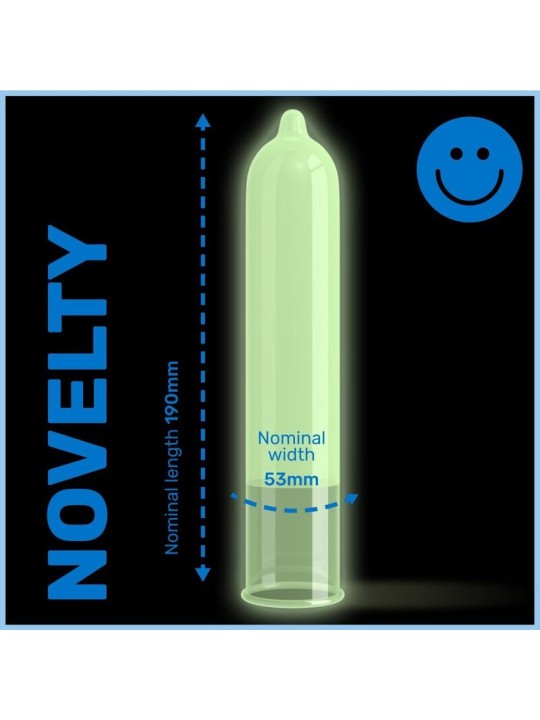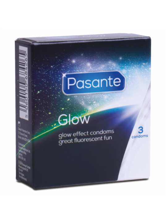 Los condones Pasante Glow brillarán en la oscuridad después de ser expuestos a la luz. Liso.