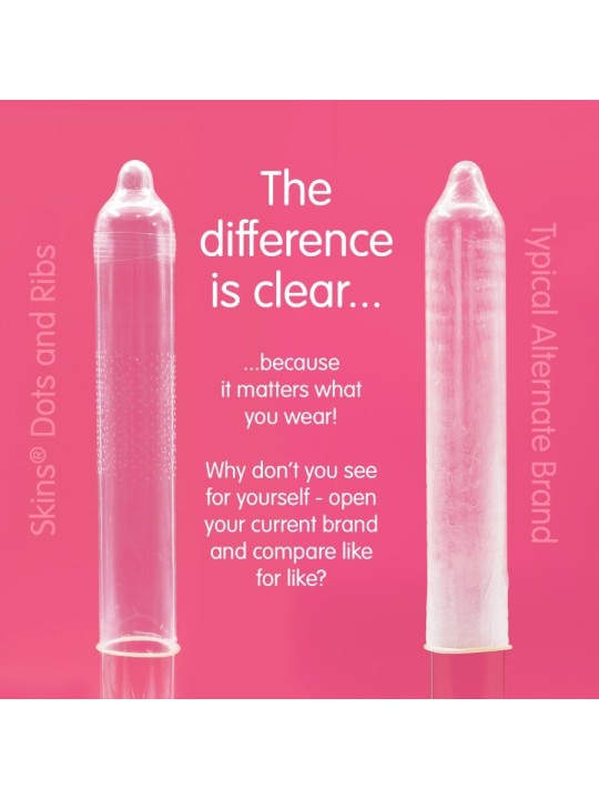 Mejora tu oferta de condones con el nuevo Skins Dots Ribs 8-Pack, un producto listo para usar que ofrece un rendimiento superior y un mayor valor. Con hasta un 33 % más de condones por paquete que el líder del mercado, este producto es perfecto para minoristas que buscan aumentar la satisfacción del cliente y el valor de la compra. Diseñados para el placer mutuo, los condones Skins Dots Ribs presentan estrías elevadas y puntos texturizados estratégicamente ubicados. Las estrías mejoran la estimulación del usuario, mientras que los puntos están diseñados para intensificar la sensación en la pareja, trabajando en conjunto para aumentar el placer para ambos. Fabricados con látex natural de primera calidad y ultrafinos para una sensación de segunda piel, estos condones ofrecen resistencia, claridad y comodidad excepcionales.