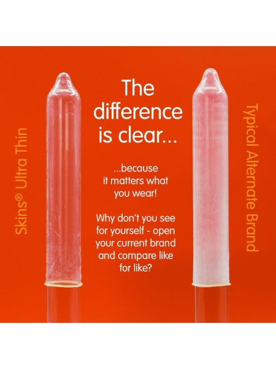 Presentamos el Skins Ultra Thin 16-Pack: un producto económico y listo para usar que ofrece hasta un 33 % más de condones por paquete que el líder del mercado. Diseñado para clientes que buscan la máxima intimidad con protección confiable, este paquete es ideal para tiendas que buscan un producto esencial premium y de alto rendimiento. Los condones Skins Ultra Thin ofrecen todas las ventajas de Skins Natural, pero con un diseño aún más fino para una mayor sensación de intimidad. Fabricados con látex natural de primera calidad, ofrecen resistencia, transparencia y una sensación de segunda piel, lo que los convierte en la opción ideal para quienes priorizan la sensación. Siéntete aún más cerca de tu pareja con el condón Skins Ultra Thin, resistente pero increíblemente fino. Con todas las características de Skins Natural, pero aún más fino, usar un Skins Ultra Thin es tan parecido a una segunda piel.