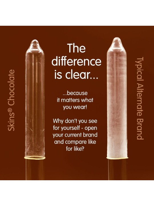 Presentamos nuestro nuevo paquete de 8 con sabor a chocolate, con un diseño elegante y listo para usar, y hasta un 33 % más de condones que el líder del mercado. Atrae a quienes buscan un producto íntimo divertido y de alta calidad con los condones Skins sabor chocolate. Estos condones envueltos individualmente combinan un sabor placentero con una protección superior, lo que los convierte en la opción ideal para tiendas de productos para adultos, farmacias y distribuidores de productos de bienestar. Estos condones Skins son una excelente manera de combinar dos amores: el sexo y el chocolate. Están lubricados y tienen un delicioso aroma a chocolate, realmente tentador, y además saben a chocolate. Como todos los condones Skins, están hechos de látex de alta calidad, dermatológicamente probado, que te brindará la protección que necesitas.